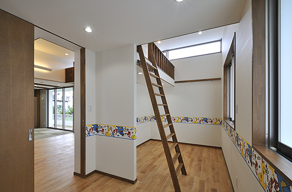 室内空間では、天井高さにメリハリを持たせ、家の中心となるリビングは開放感のある空間とし、子供部屋にはロフトを設けました。