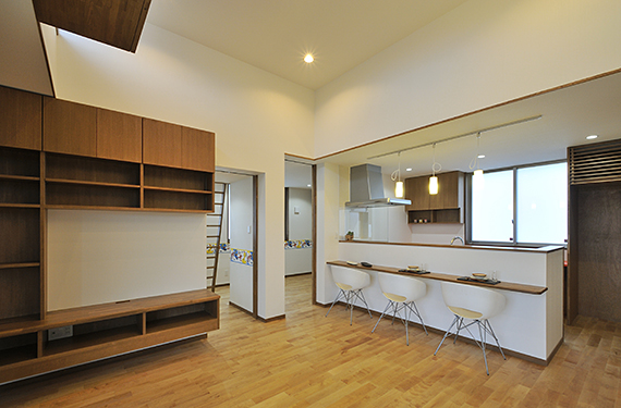 室内空間では、天井高さにメリハリを持たせ、家の中心となるリビングは開放感のある空間とし、子供部屋にはロフトを設けました。