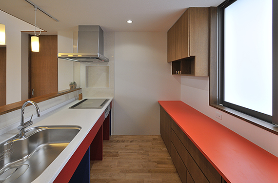 また、キッチン及び食器棚はオーダーメイドで、リビング側には食事もできるカウンターも設置しました。